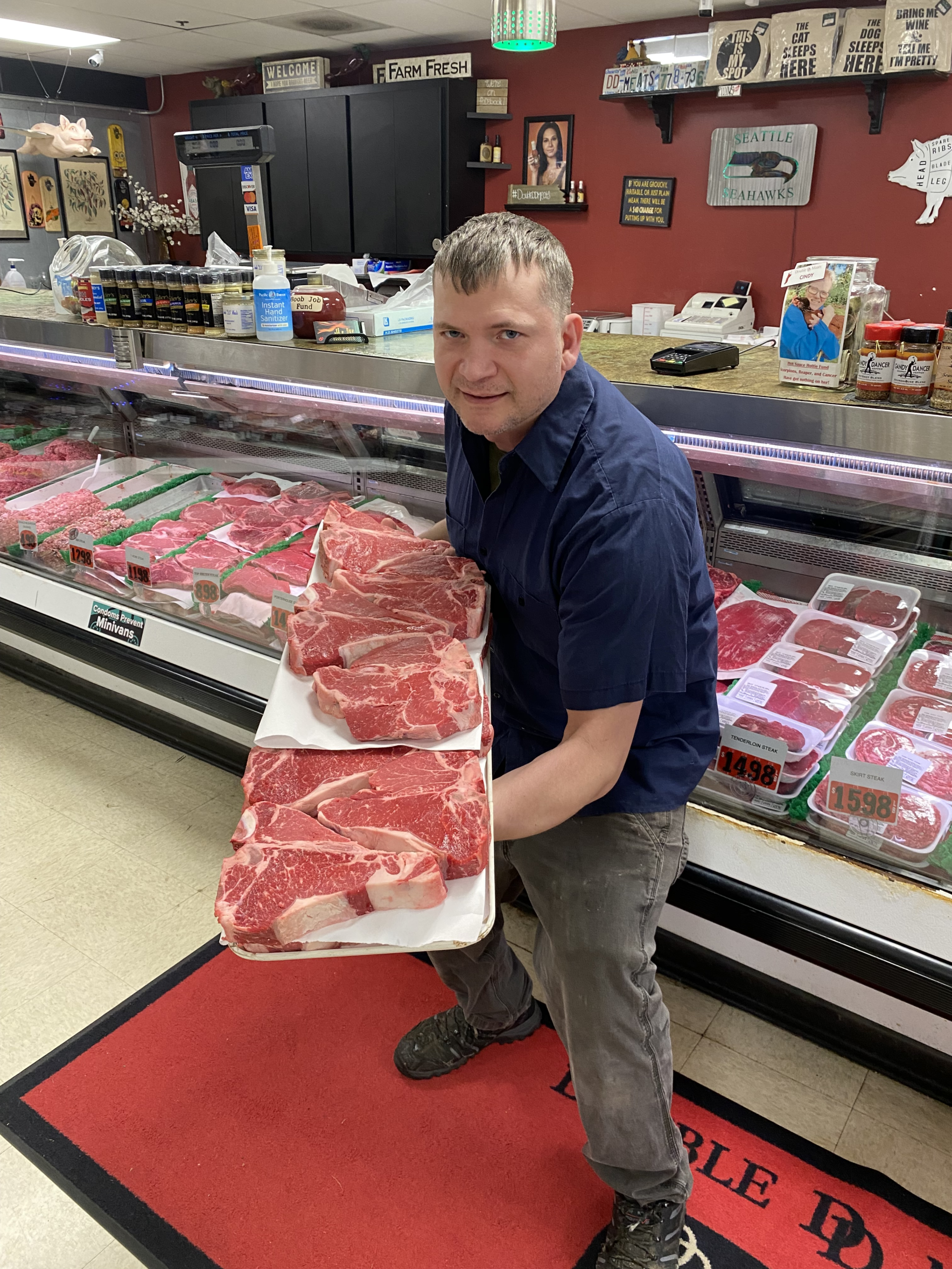 Lester's daughter, Kim Nygard, started when she was 17 years old and worked with her father when she wasn't working on the dairy farm with her husband. In 2014, she purchased the market from her dad. She not only expanded the team to over 50 employees, but she also took her mother's selection of sauces and made it the nation's largest, boasting over 3,000 sauces. Her two sons, Justin and Jeremy, have come back to work after graduating from UW and plan to take over when Kim retires. Justin oversees the front half of the store while Jeremy leads the processing team, cutting the meats the way their grandfather did. Even Kim's niece, Kayla, manages the smoked and frozen sections of the store. Three generations at work at DD.